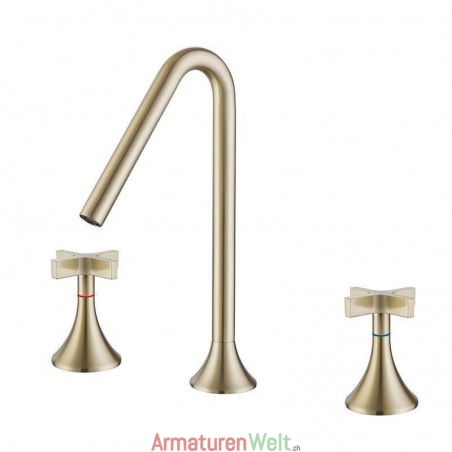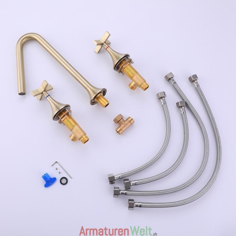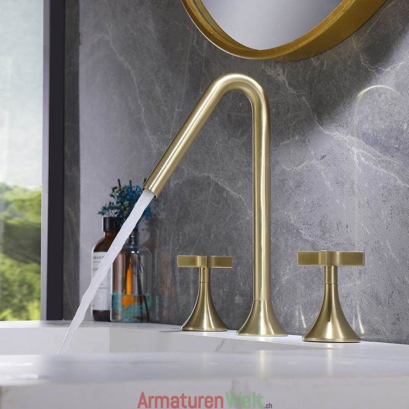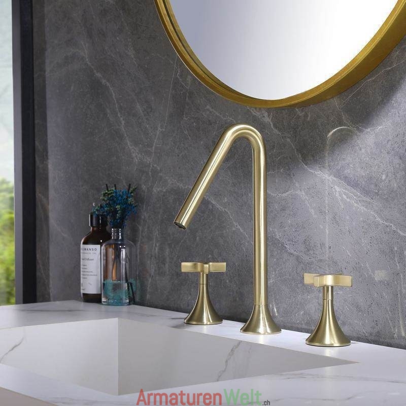Eleganter, gebürsteter, goldfarbener, weit verbreiteter Warm- und Kaltwasserhahn für das Waschbecken im Badezimmer
