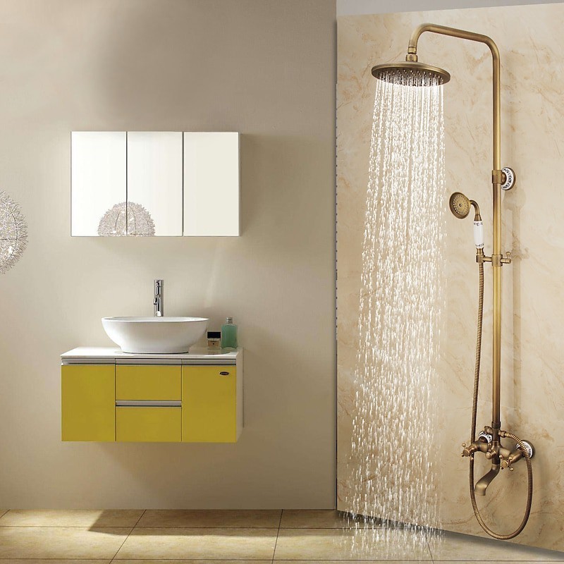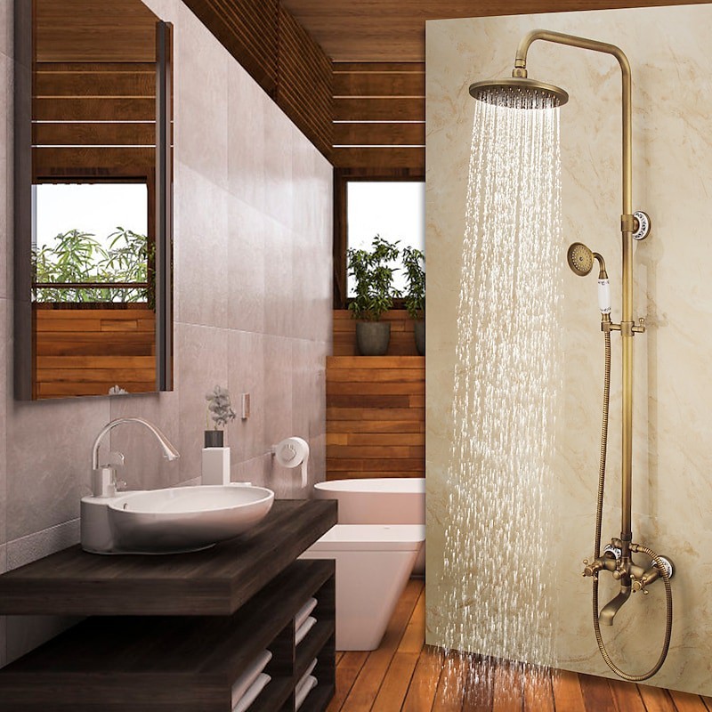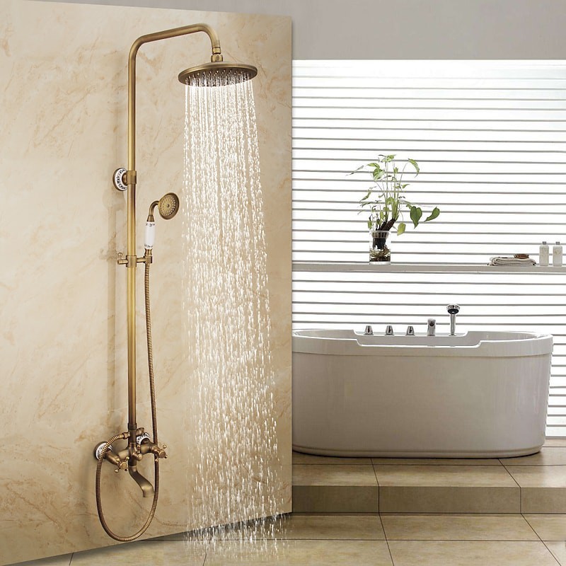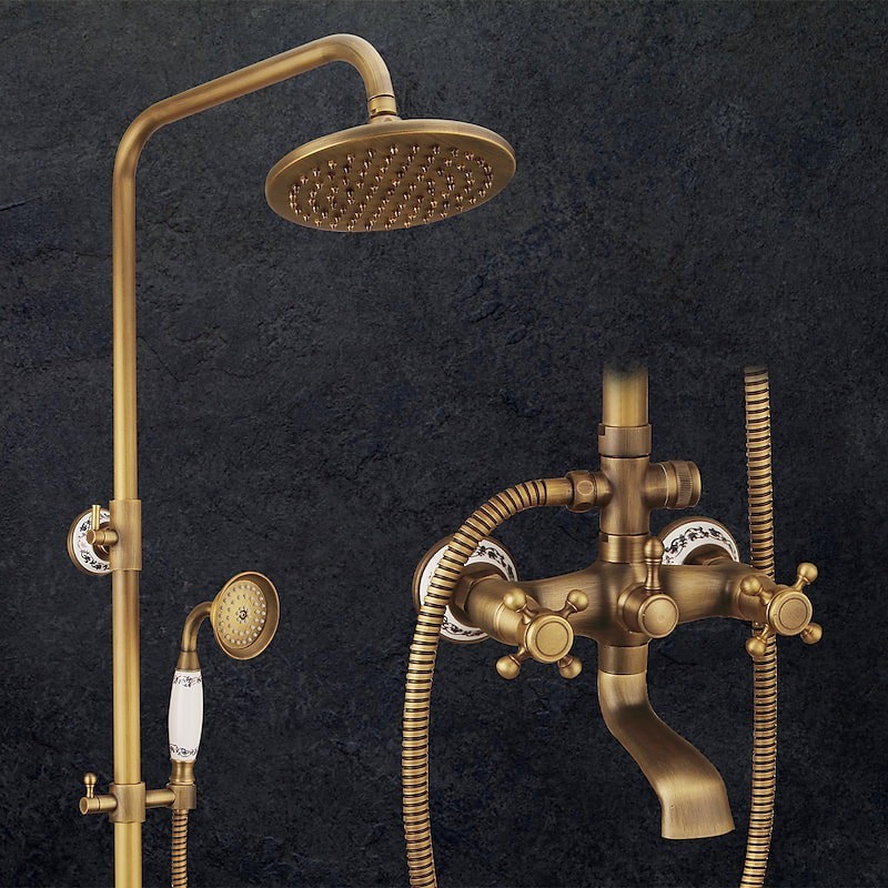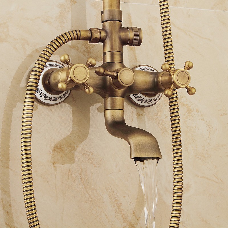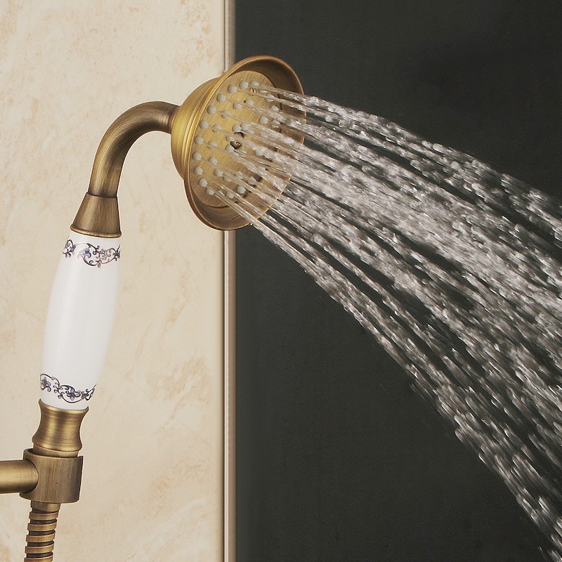 Stil:Vintage-Stil,Landhausstil,Funktionen:Ausziehbrause,Handbrause inklusive,Wasserfall,Wasserhahn Typ:Duschsystem,Installationstyp:Außenmontage,Kalt- und Warmschalter:Ja,Ventiltyp:Keramikventil,Finish:Antikes Messing,