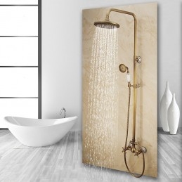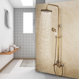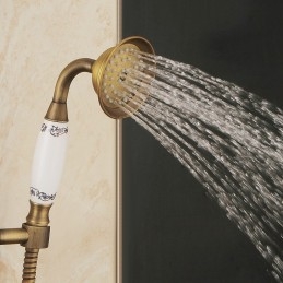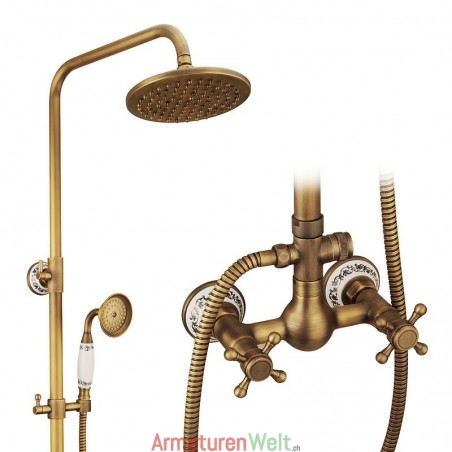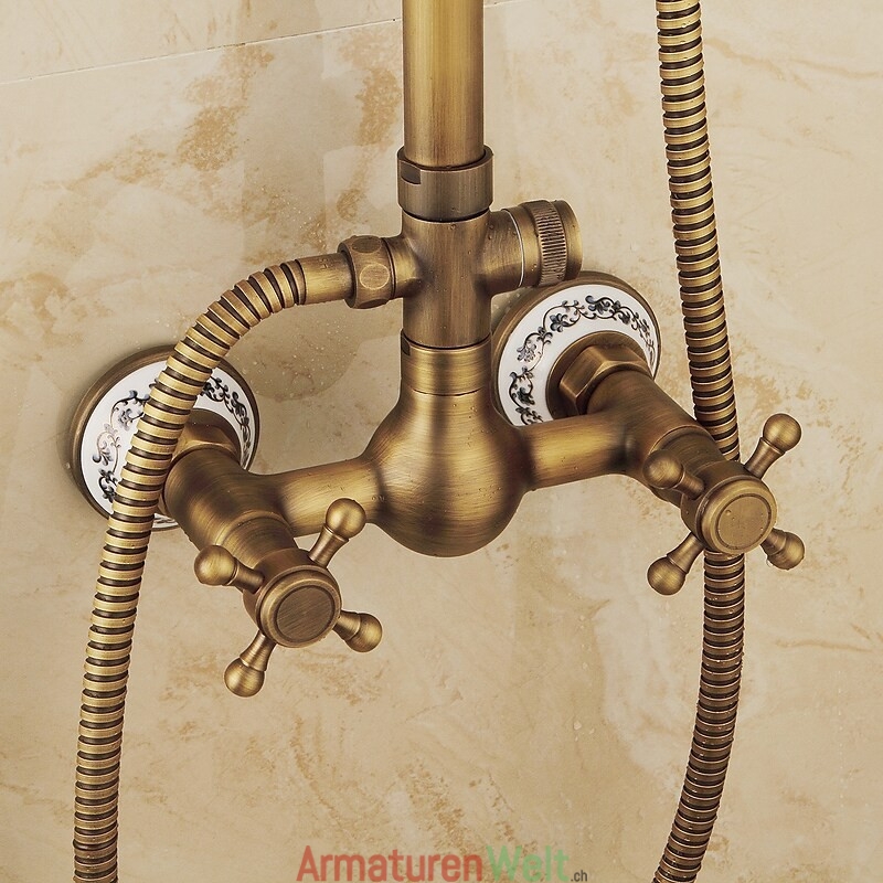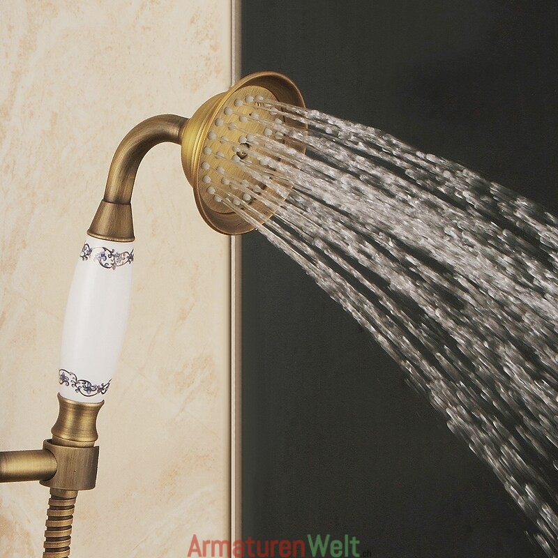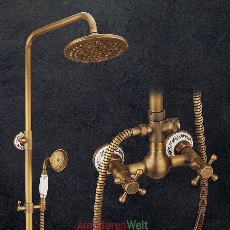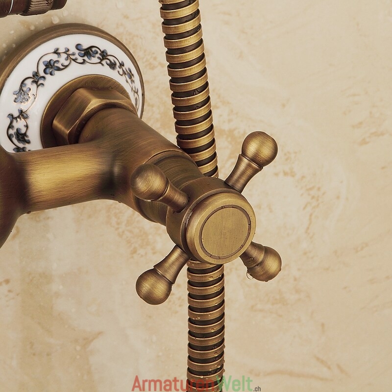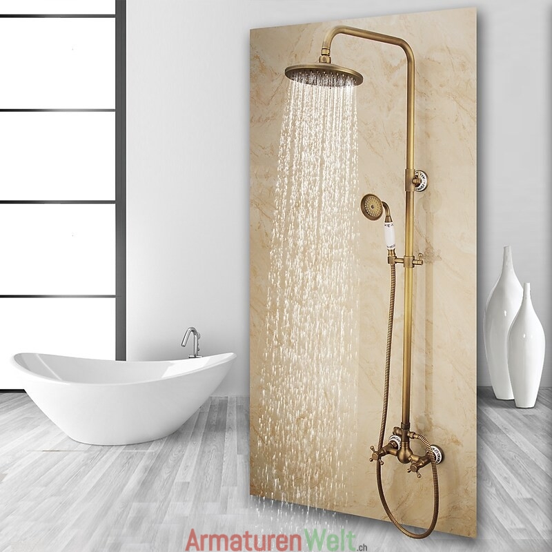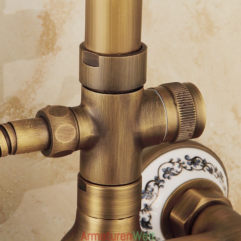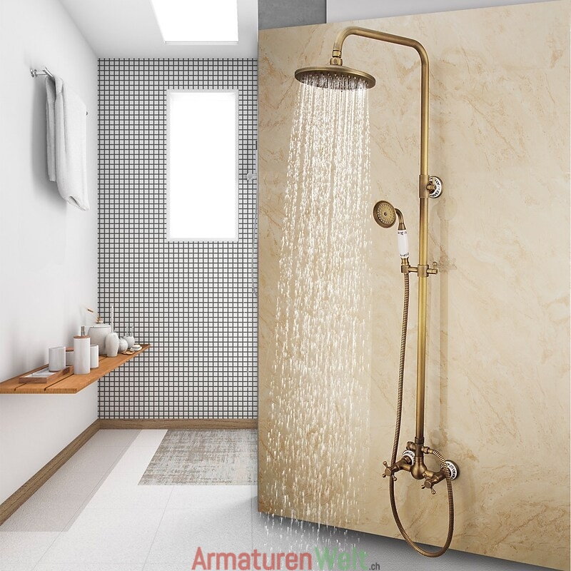 Stil:Vintage-Stil,Landhausstil,Funktionen:Handbrause inklusive,Wasserfall,Regendusche,ausziehbar,Wasserhahntyp:Regenbrausensystem,Duschsystem,Installationstyp:Außenmontage,Kalt- und Warmschalter:Ja,Ventiltyp:Keramik Ventil,Finish:Antikes Messing,