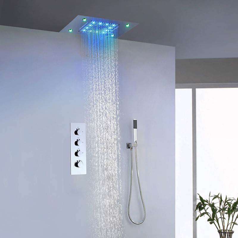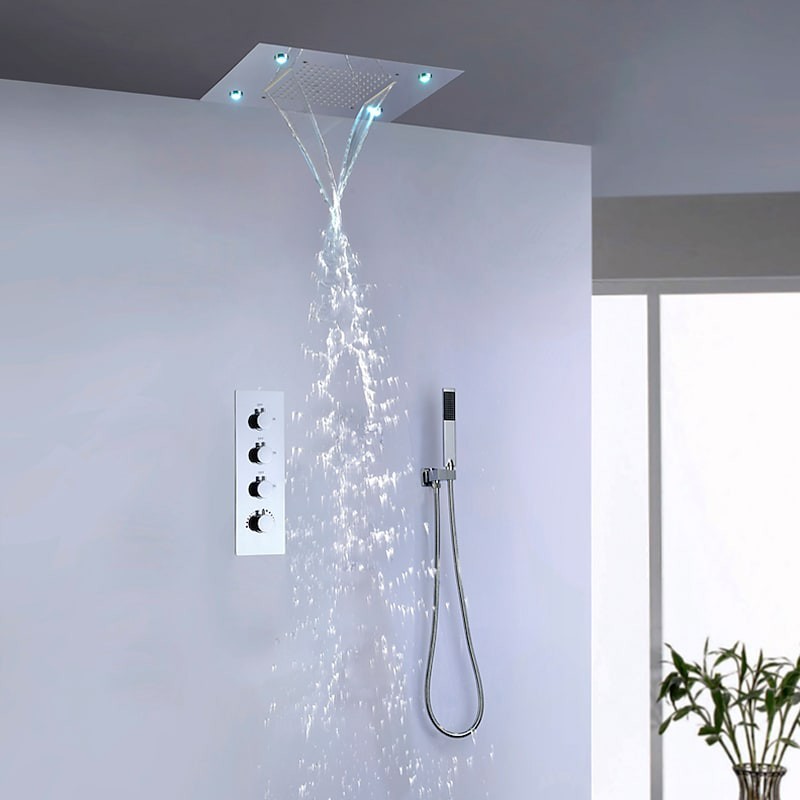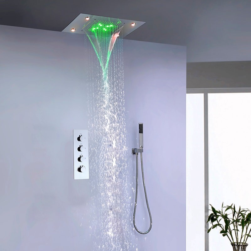 Stil:Zeitgenössisch,Funktionen:Regendusche,Wasserhahntyp:Duschset,Installationstyp:Wandmontage,Durchflussrate (L/min):5,55 GPM (21 L/min),Kalt- und Warmschalter:Ja,Ventiltyp:Keramikventil,Finish:Chrom,Besonders ausgewählte Produkte:heiß,Montagelöcher und Griffe:Vier Griffe, drei Löcher,