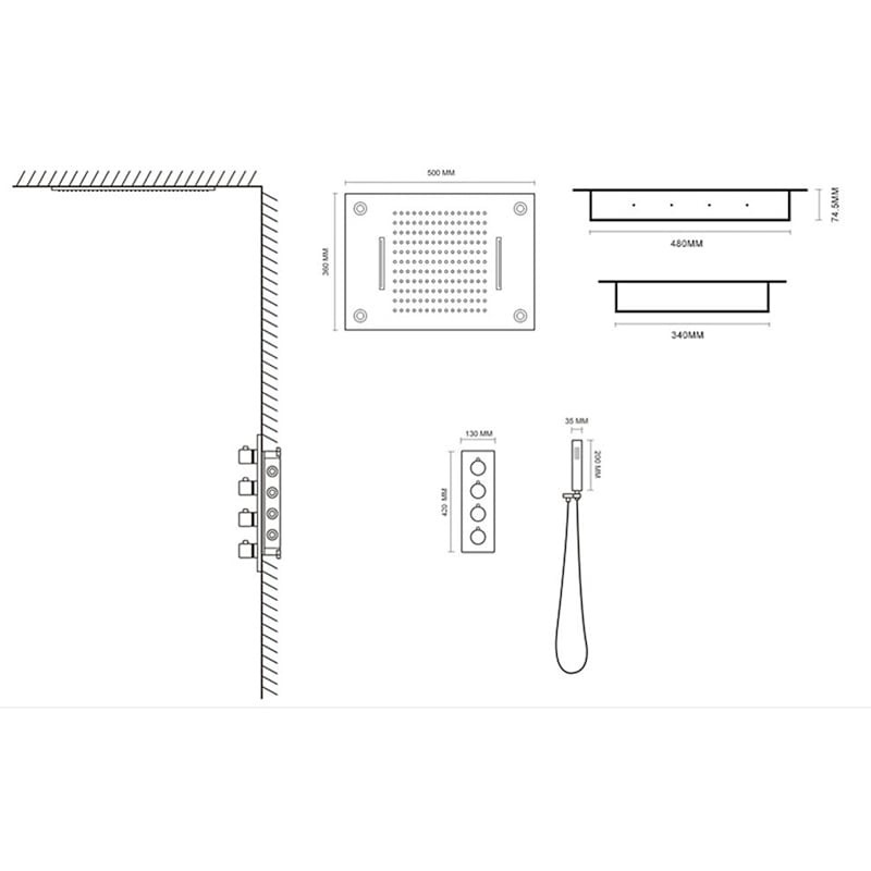 Gesamthöhe (cm):79 cm x 46 cm x 21 cm (31,1 '' x 18,1 '' x 8,2 ''),Breite des Duschkopfs (cm):50 cm x 36 cm x 7,4 cm (19,7 '' x 14,2 '' x 3 ''),
